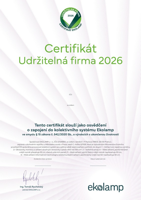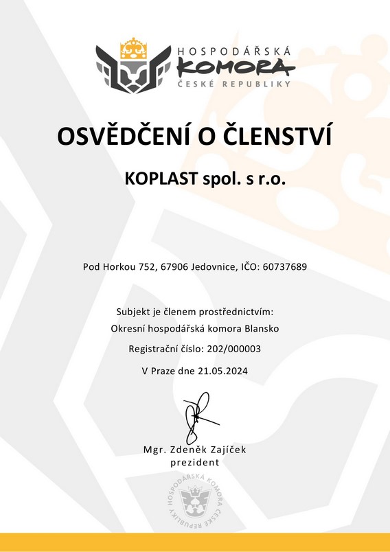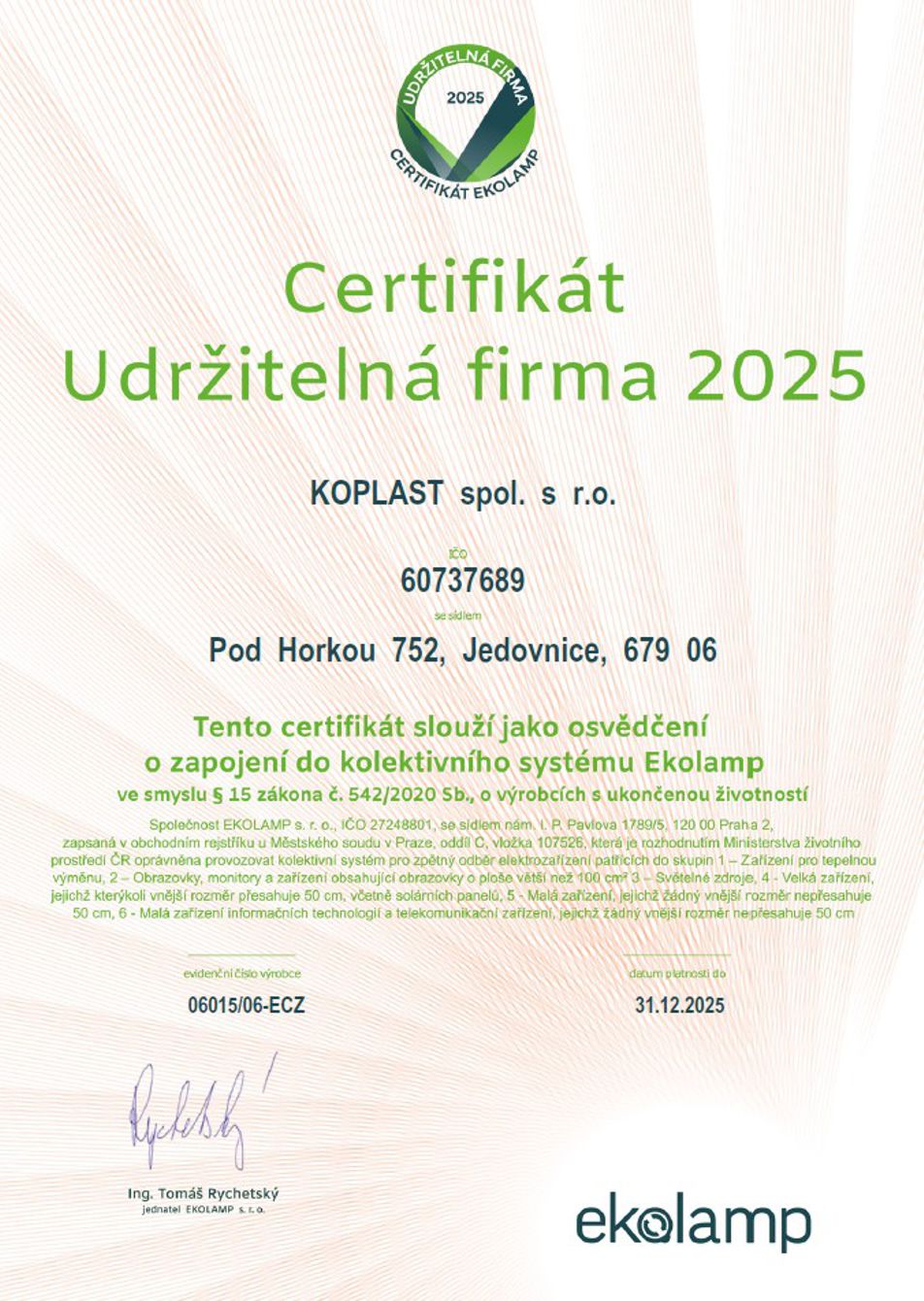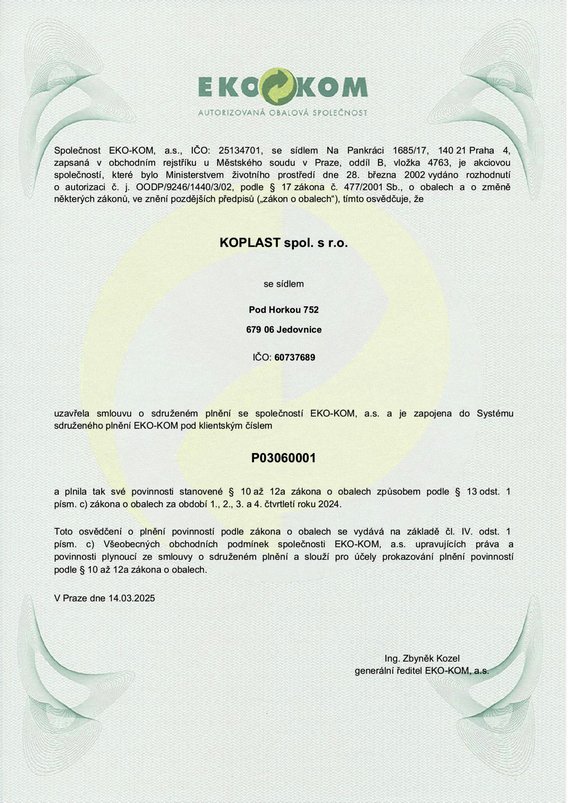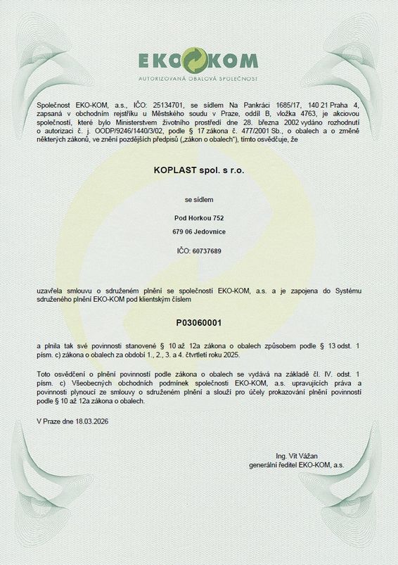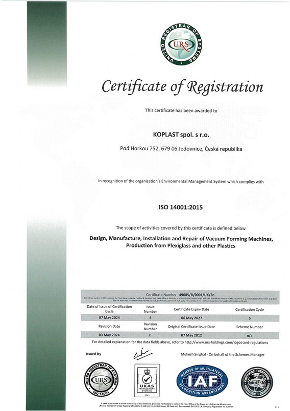 Im Mai 2012 haben wir ein integriertes System der Normen ČSN EN ISO9001:2008 und ČSN EN ISO14001:2004 eingeführt, das jedes Jahr regelmäßig geprüft wird.Im April 2024 haben wir erfolgreich ein Rezertifizierungsaudit für die neuen Normen ČSN EN ISO9001:2016 und ČSN EN ISO14001:2016 bestanden, die wir weiterentwickeln und auditieren.